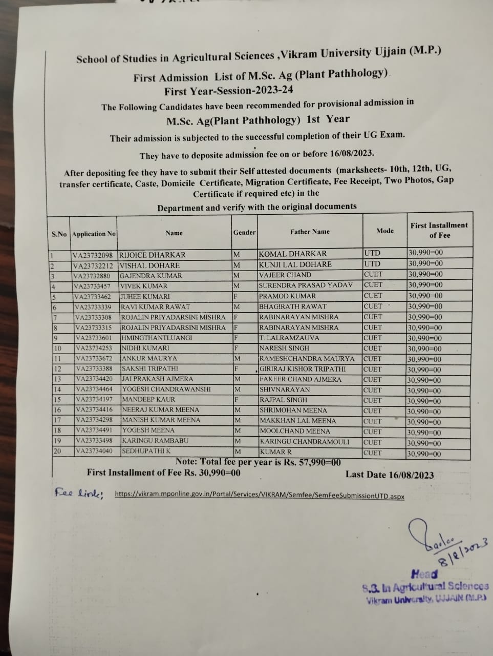 First Admission list of M.Sc.Ag(Plant Pathology) I Yr 2023