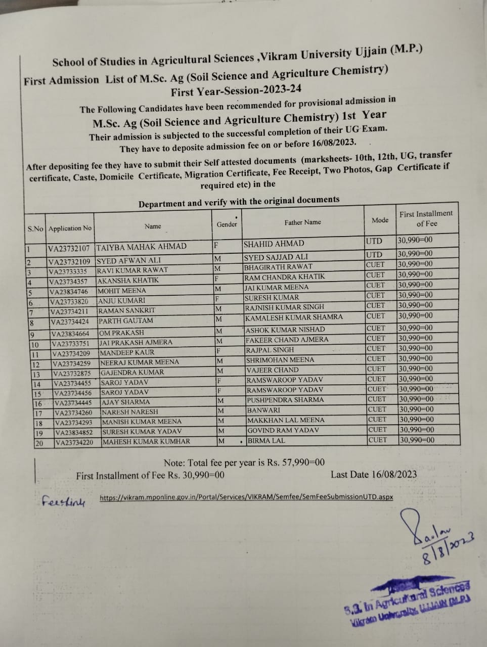 First admission list of M.Sc.Ag(Soil Sc.& Agriculture Chemistry) I Yr 2023