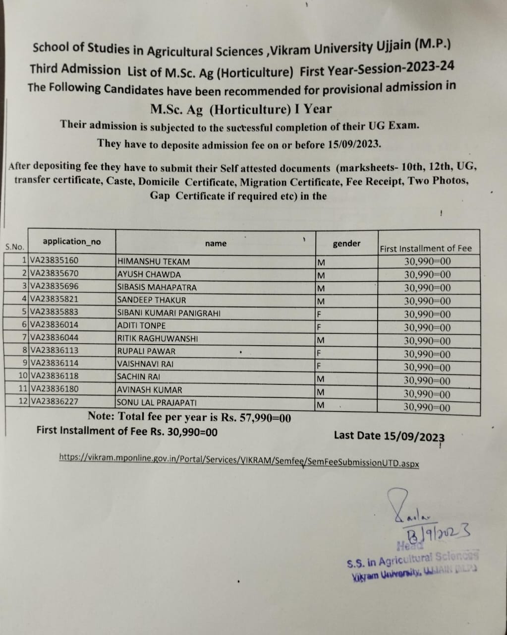 Third admission list of M.Sc. Ag(Horticulture) I Yr. 2023-24