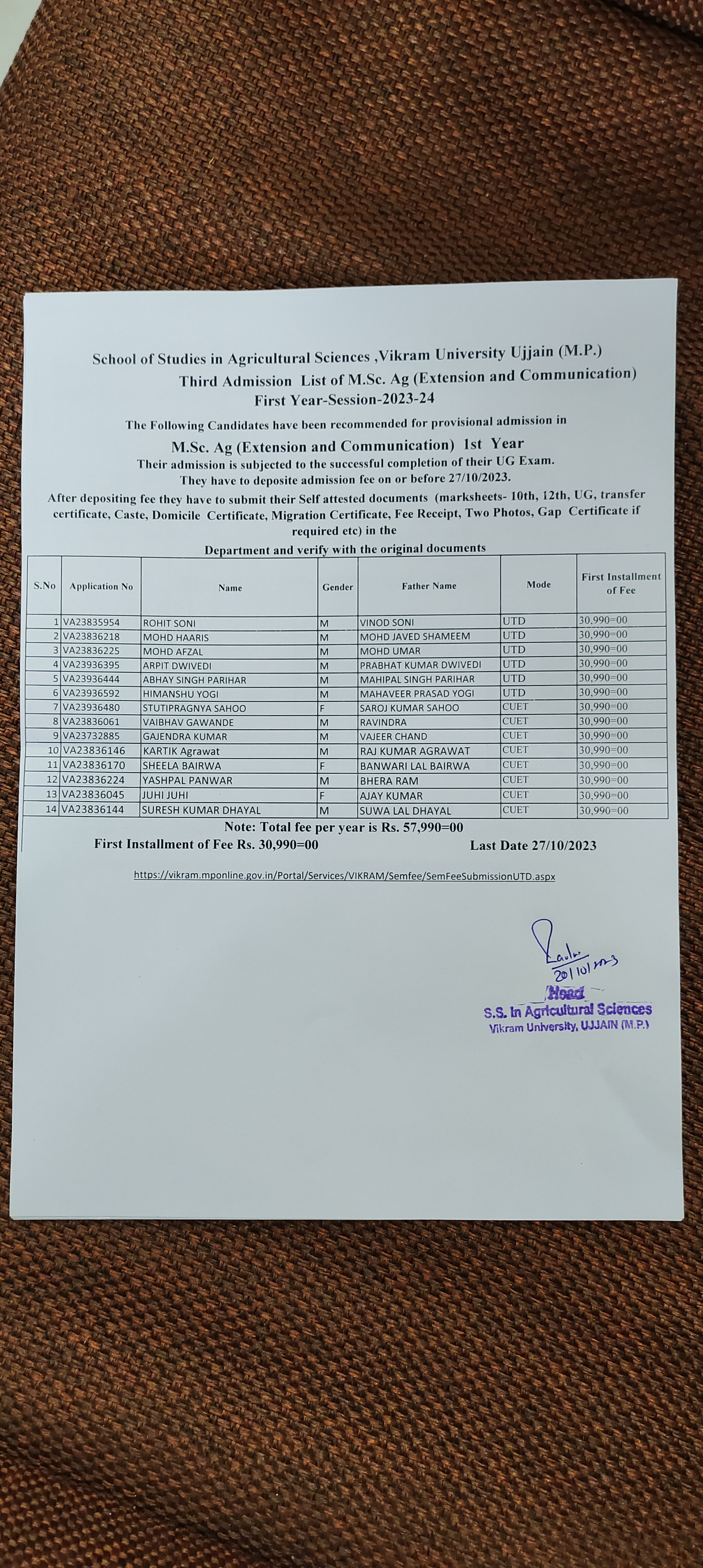 Third admission list M.Sc.Ag(Extension and Communication) I Yr 2023-24