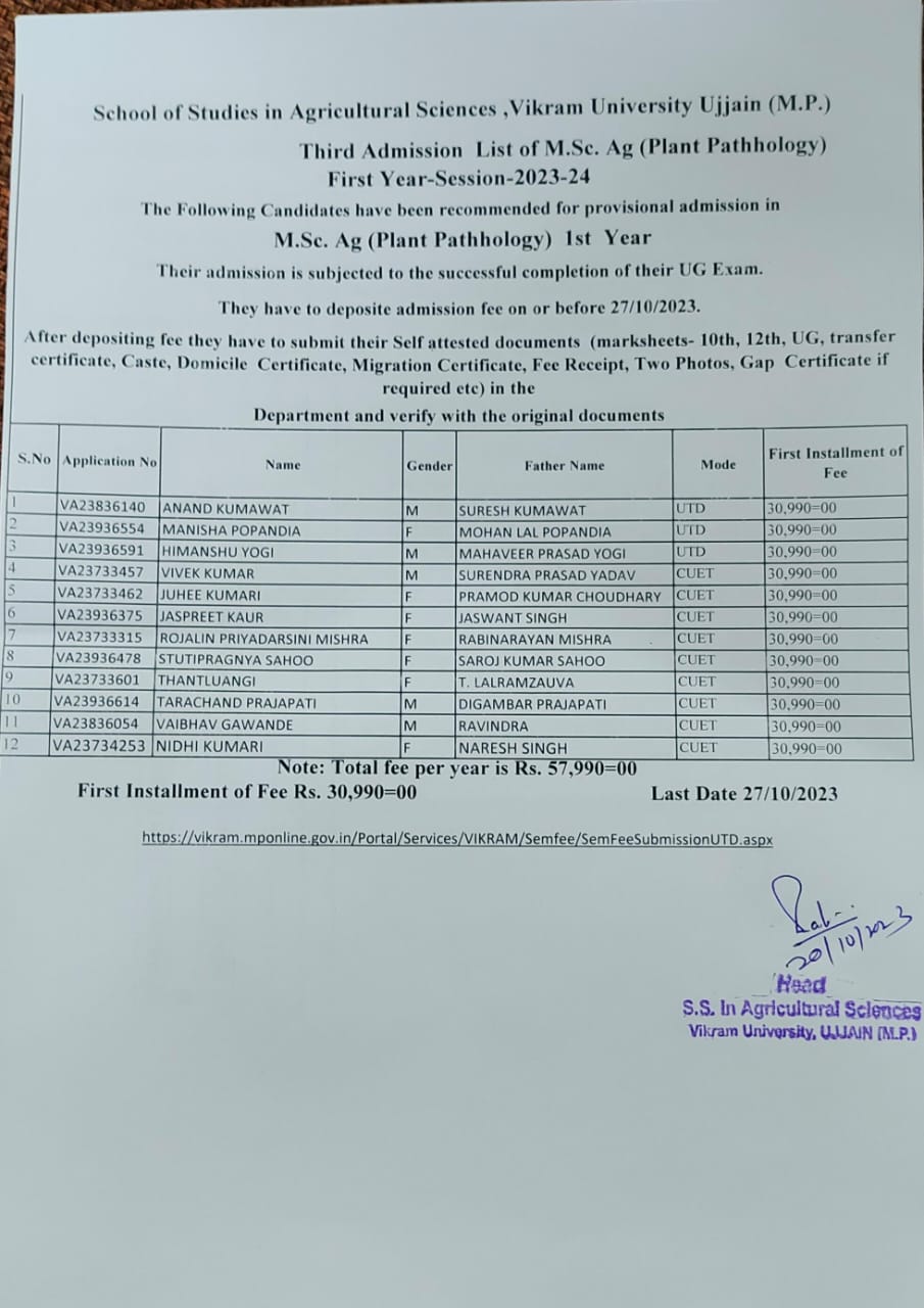 Third admission list M.Sc. Ag (Plant Pathology) I Yr 2023-24
