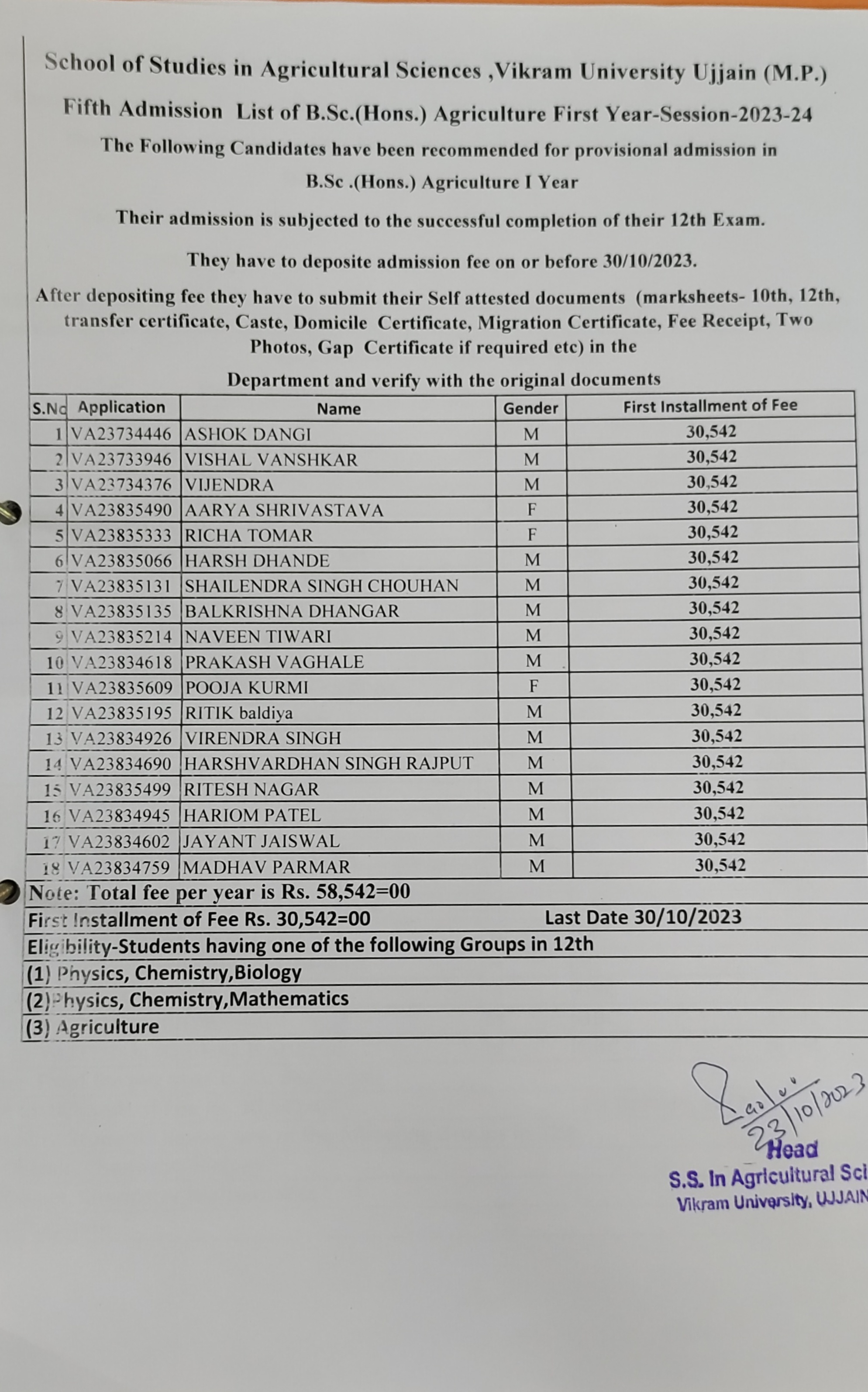 Fifth Admission List of B.Sc.(Hons.) Agriculture First Semester 2023-24