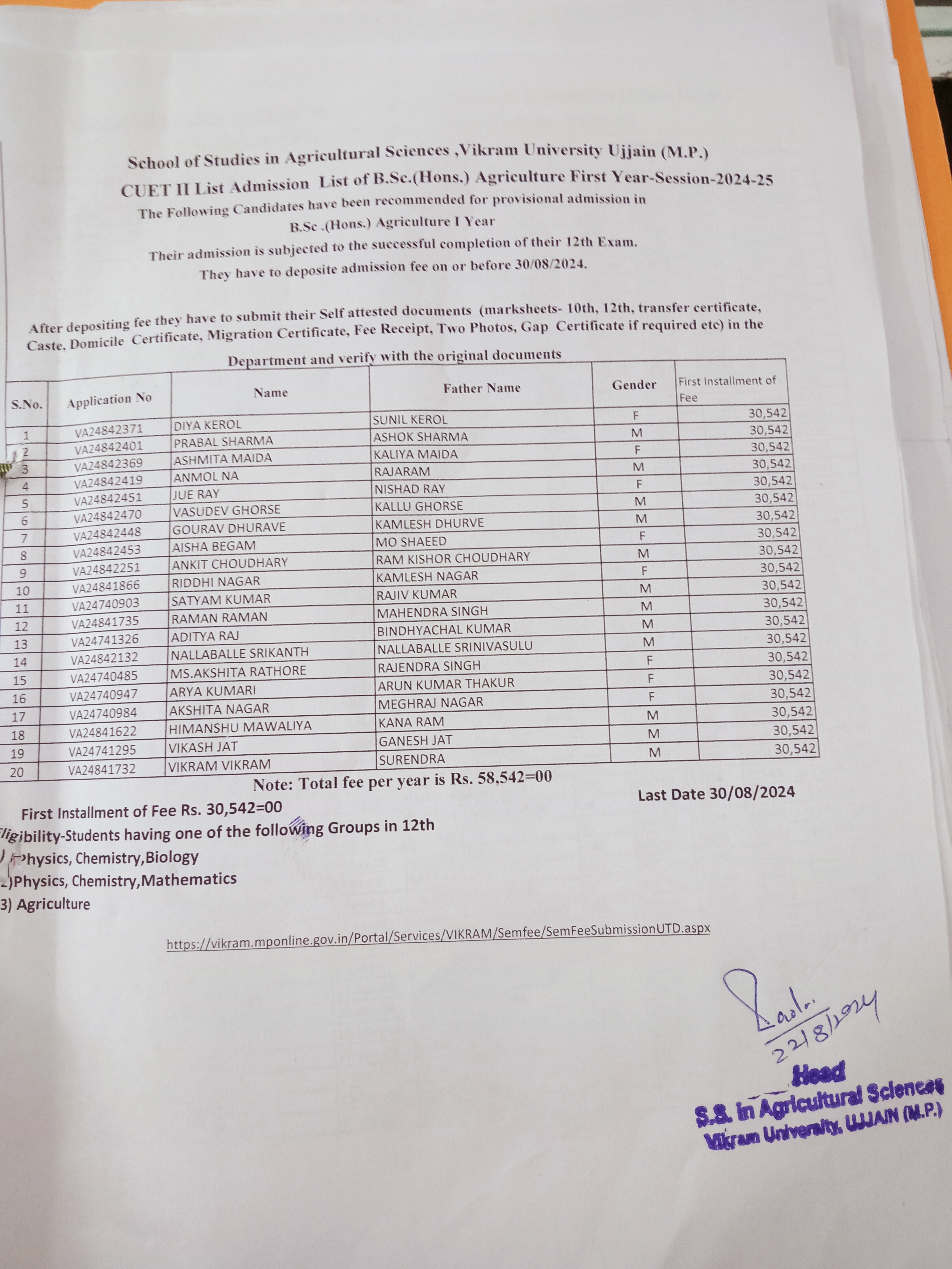 CUET II admission list BSc(H) Agriculture I Yr. 2024-25