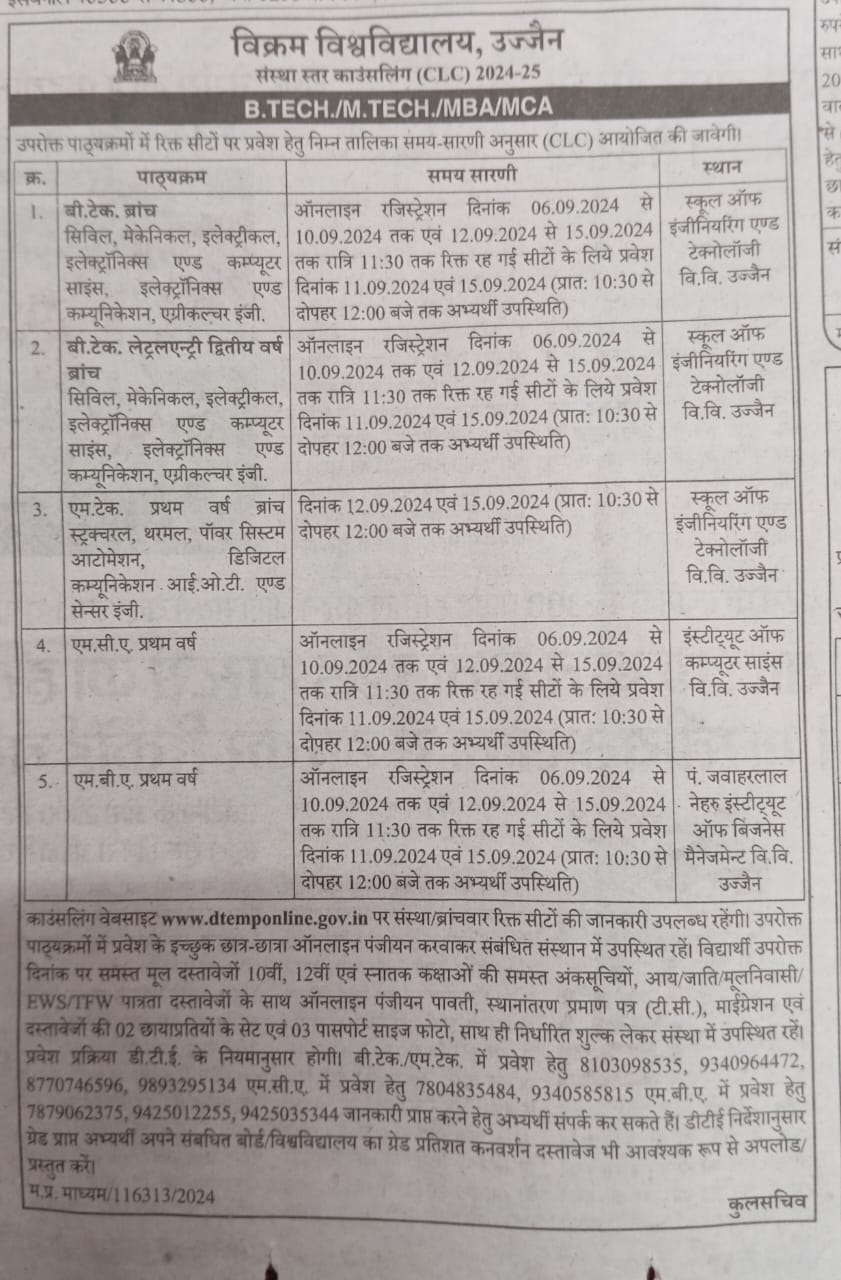 Institute Level Counselling (CLC) for B.Tech., M.Tech., MBA & MCA 2024-25