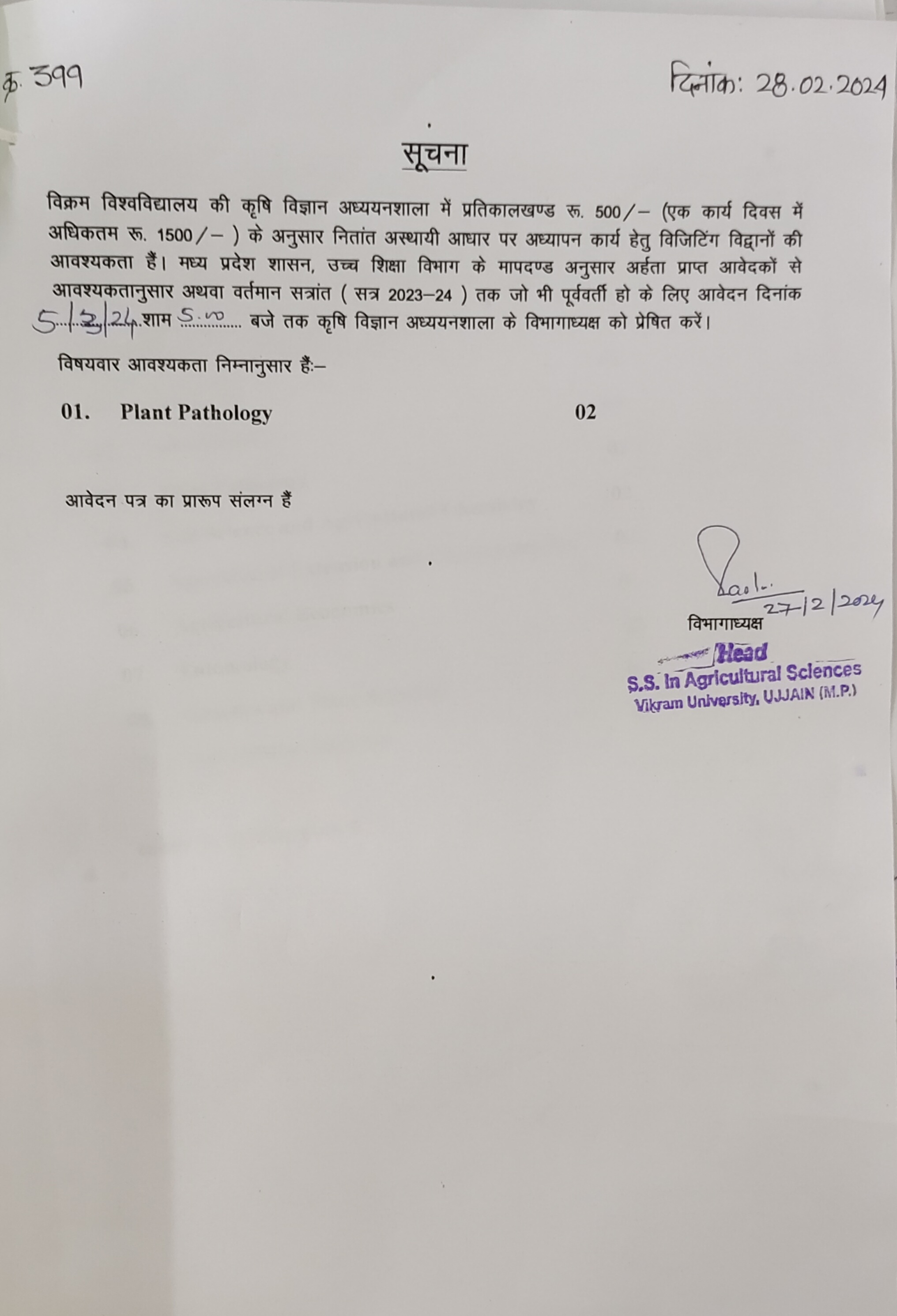 नितांत अस्थायी आधार पर विजिटिंग विद्वान (प्लांट पैथोलॉजी) की आवश्यकता